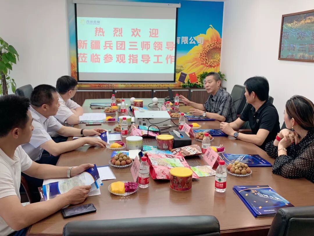 新疆生产建设兵团第三师党委常委副师长佘瑞元、喀什经济开发区兵团分区管委会副主任庞然,第三师招商局副局长等一行领导对广东西域金葵农业发展有限公司的讲解非常满意。此次来访一是视察企业资质,二是了解企业发展情况。