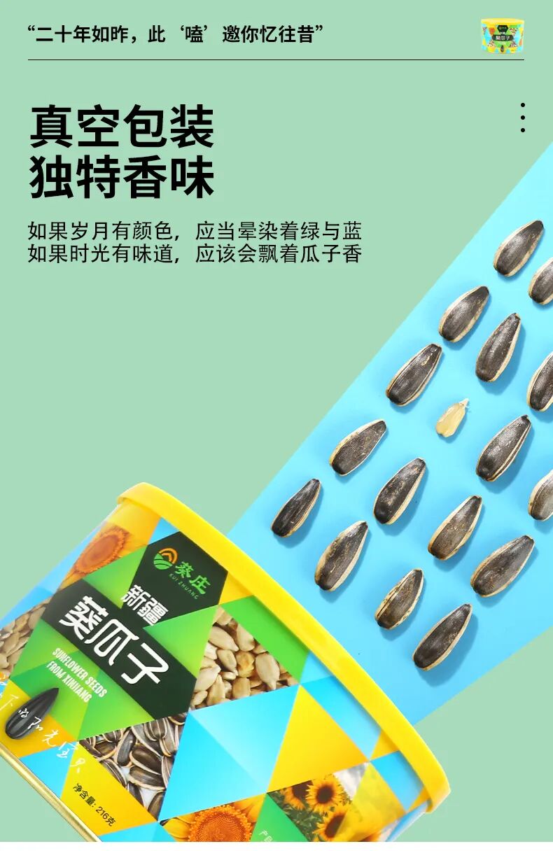 葵庄原味瓜子产自新疆阿勒泰 地处欧亚大陆腹地、新疆北部 素有“金山银水”美誉 这里年日照约3000个小时 年平均无霜期可达151天 阿尔泰山融化的雪水浇灌 得天独厚的气候 零污染的生态环境 葵庄原味瓜子生产车间 为了保留瓜子的营养成分 葵庄使用世界一流的全自动化生产线 历经层层筛选 ﹀ ﹀ ﹀ ﹀ ﹀ ﹀ 五一特惠 原价28元/罐 现价20元/罐 5罐包邮 活动时间 5月1日-5月5日 淘宝企业店购买看这里