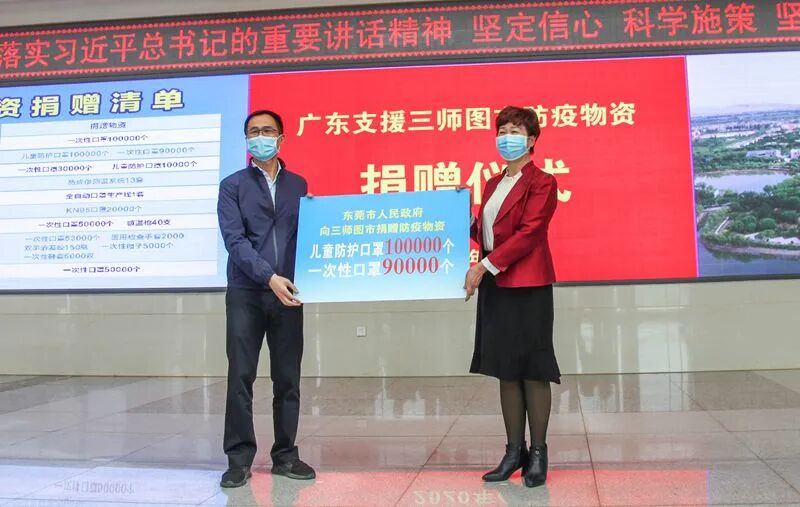 新冠肺炎疫情发生以来,广东援疆前方指挥部、东莞市人民政府、江门市人民政府等单位积极筹集、广泛动员社会力量先后向三师图市捐赠了多批防疫物资,口罩逾50万只(其中儿童防护口罩11万只、KN95口罩2万只)、全自动口罩生产线1套、热成像测温系统13套等。 当天上午,捐赠仪式在三师图市职工活动中心大楼举行。 广东援疆前方指挥部总指挥、喀什地区地委副书记王再华代表广东援疆前指;东莞援疆工作队队长,三师图市党委副书记、副师长梁杰钊代表东莞市人民政府分别进行了捐赠。健客集团、广东西域金葵农业发展有限公司、绿美南疆林业产业园、东纯兴集团等相关援疆企业也进行了捐赠。 捐赠仪式上,三师图市党委副书记、副师长李成盛对广东各界的热心捐赠表示衷心感谢!他表示,广东各界动真情、出实招、办实事、求实效,为师市抗击疫情汇聚了暖流、增添了动力,师市各族职工群众将永远铭记于心。师市一定会用好广东各界爱心捐赠的防疫物资,在学校复课复学和企业复工复产等方面精准发放,切实发挥好捐赠物资的最大效益。 王再华在讲话中表示,“师市所需,广东所能”,尽管疫情延缓了我们援疆干部人才进疆时间,但我们一直心系师市,通过各种不同方式参与和支持三师图市疫情防控工作。接下来,我们将继续发挥广东人务实的优良传统,增进与三师职工群众的深情厚谊,高标准高效率高质量推进各项援疆项目建设,全力推动对口支援三师图市工作迈上新台阶、开创新局面、谱写新篇章。 参加捐赠仪式的领导还有,三师图市党委常委、副师长康金华,三师图市副师长佘瑞元,广东援疆前方指挥部副总指挥黄昌建,广东援疆前方指挥部相关处室处长。